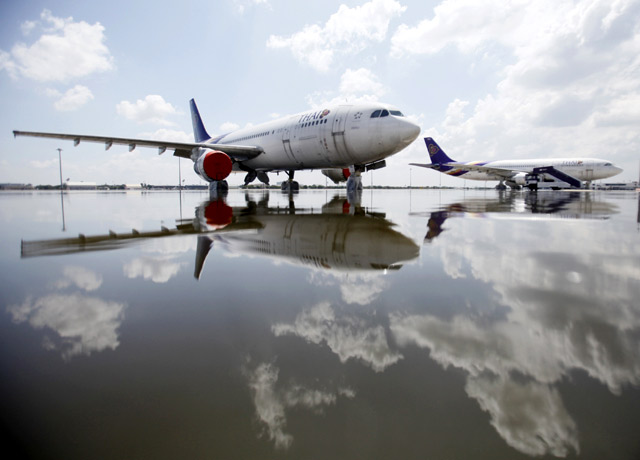 Bencana banjir di Thailand belum juga berakhir. Selain menggenangi rumah warga, banjir ini juga merendam bandara Don Muang, Bangkok, Rabu (26/10/2011).