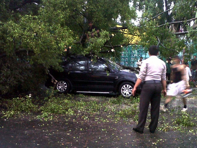 2 Pohon tumbang di depan GOR Bulungan, Jakarta Selatan, Rabu (26/10/2011). Pohon ini tumbang menimpa sebuah mobil yang sedang lewat. Buruntung tidak ada korban.