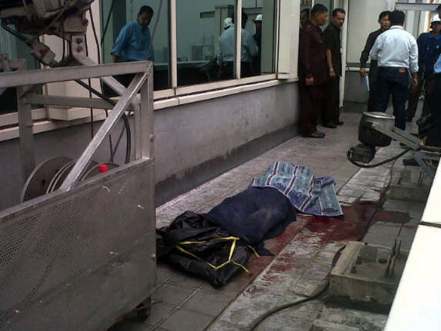 Seorang pekerja tewas akibat terjatuh dari gondola di Menara Batavia, Tanah Abang, Jakarta Pusat, Rabu (26/10/2011). Korban bernama Fahrudin langsung dilarikan ke RSCM.