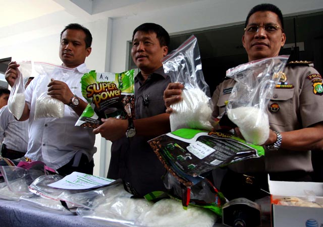 Polda Metro Jaya menggelar barang bukti sabu yang disita dari jaringan pengedar narkoba internasional, Kamis (27/10/2011). Selain itu, Polda Metro juga memperlihatkan para tersangka.