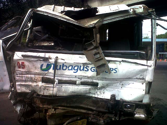 Sebuah truk trailer dari arah Ancol menuju Cawang tiba-tiba banting stir ke arah Tanjung Priok. Kepala truk tersebut akhirnya menabrak pembatas jalan dan jatuh ke jalan umum di bawahnya, Kamis (27/10/2011).