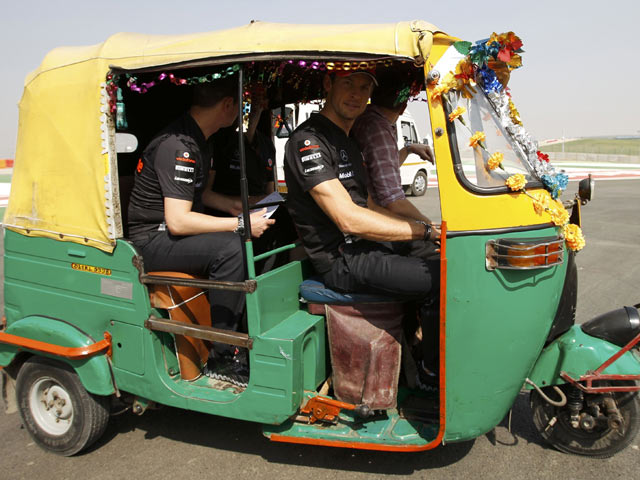 Para pembalap F1 mulai berusaha mengenal sirkuit Buddh International di India yang akan menggelar balapan untuk pertama kalinya akhir pekan ini. Pembalap McLaren Jenson Button berusaha mengenali sikuit tersebut dengan mengendarai bajaj.