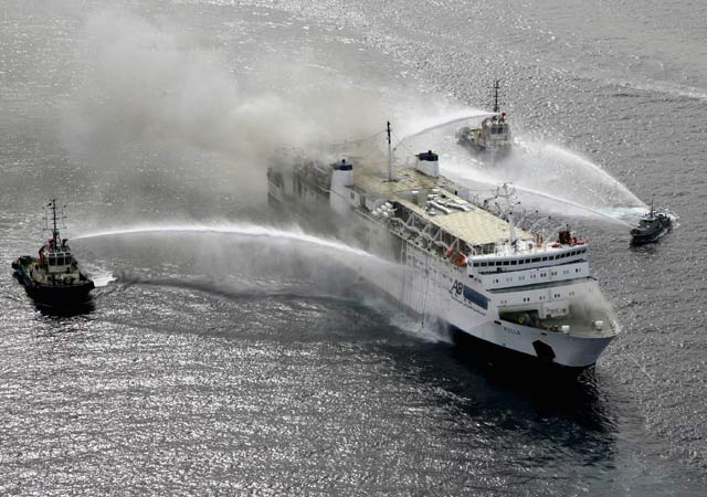 Sebuah kapal feri yang mengangkut lebih dari 1.000 warga Mesir terbakar di perairan Laut Merah, Yordania, Kamis (3/11/2011). Sejauh ini belum ada laporan korban jiwa dalam kejadian itu.