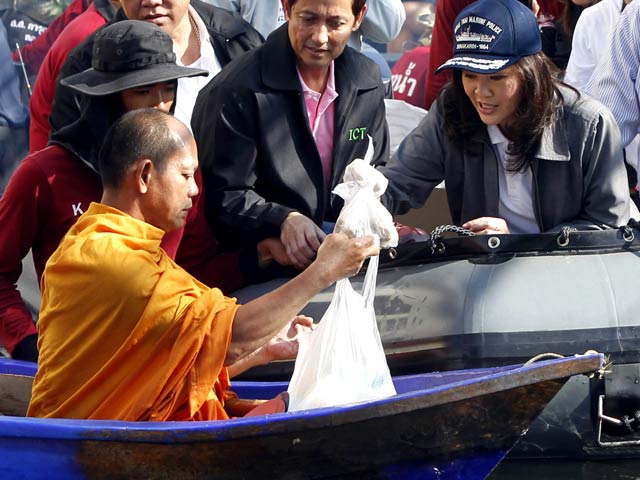 PM Thailand Yingluck Shinawatra mengunjungi daerah yang dilanda banjir di distrik Don Muang, Bangkok, Kamis (3/11/2011). Dalam kesempatan tersebut, PM Thailand juga memberikan bantuan kepada korban banjir.