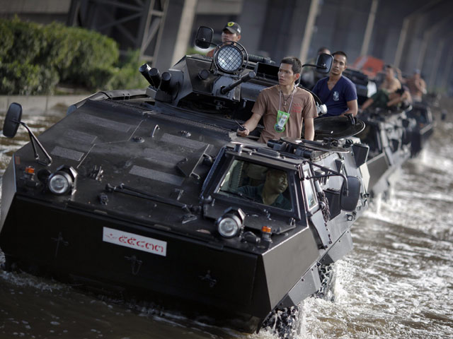 Jalan-jalan di Bangkok yang lumpuh akibat banjir juga berdampak pada militer Thailand. Untuk melintasi jalan raya, militer Thailand bahkan harus menggunakan kendaraan lapis baja.