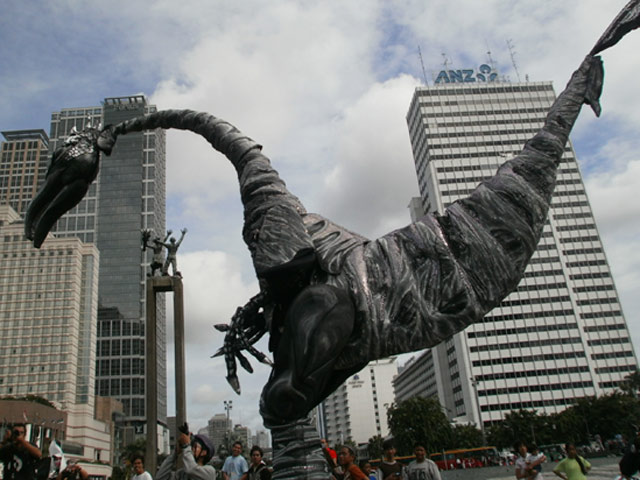 Sebanyak 3 ekor "dinosaurus" berkeliaran di bundaran Hotel Indonesia, Jakarta, Minggu (18/12/2011). Kegiatan ini adalah rangkaian acara Biennale yaitu perhelatan seni rupa international.