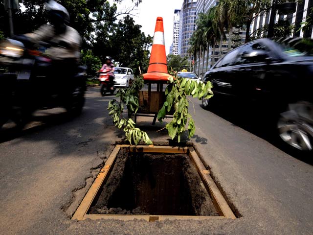 Sebuah lubang menganga di Jalan Jenderal Sudirman, Jakarta, Selasa (14/2/2012). Lubang tersebut sangat membahayakan penggunakan jalan karena posisinya berada di tengah jalan.