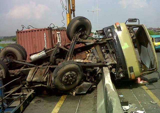 - Truk Trailer Terguling di Tol Dupak-Gresik