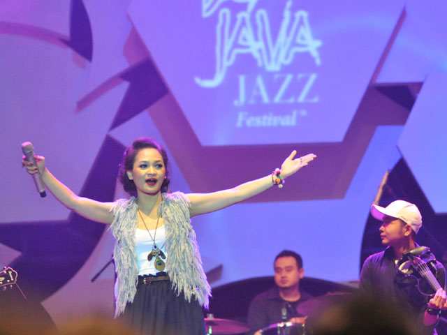 Untuk kesekian kalinya penyanyi Andien ambil bagian dalam pagelaran jazz tahunan yang kali ini diselenggarakan di PRJ Kemayoran, Jumat (2/3/2012) malam. Ia pun tampil modis dengan rompi berbulu-bulu. (Foto-foto: Antara/Paramayudha)