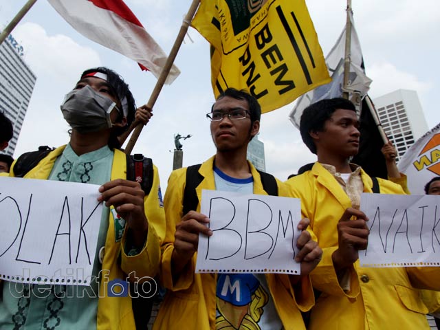 Mahasiswa dari Badan Eksekutif Mahasiswa (BEM) Seluruh Indonesia berdemo menolak rencana pemerintah menaikan harga Bahan Bakar Minyak (BBM) di bundaran HI, Jakarta, Jumat (16/3/2012). Mereka memberikan solusi dengan melakukan negosiasi ulang kontrak-kontrak tambang yang sangat merugikan untuk menutup beban subsidi BBM.