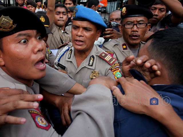Aksi dorong antara mahasiswa dan polisi terjadi di depan Kantor Kementrian Energi dan Sumber Daya Mineral (ESDM), Jl Thamrin Jakarta, Jumat (16/3/2012). Selain itu, pendemo juga menggelar aksi teatrikal untuk menolak rencana Menteri ESDM Jero Wacik menaikan harga Bahan Bakar Minyak.