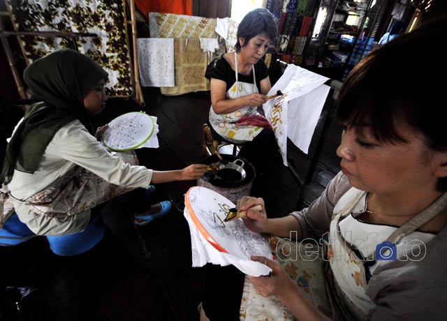 Dua warga Jepang belajar membuat batik tulis di Museum Tekstil, Jakarta, Sabtu (17/3/2012). Selain sekedar untuk mempelajari cara membatik, hasil karyanya terserbut juga akan dibawa pulang ke negaranya sebagai buah tangan.