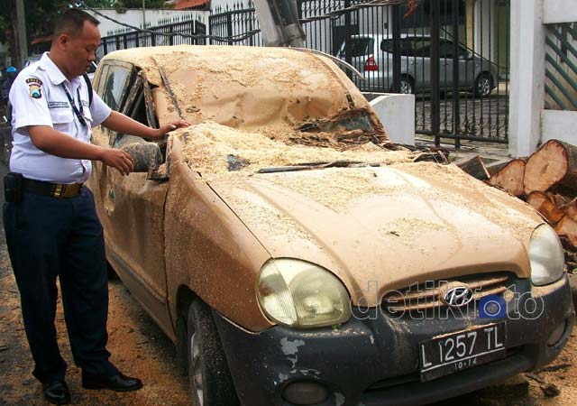 Hujan deras disertai angin kencang membuat beberapa pohon tumbang. Salah satunya di Jalan Jemursari No 177, Surabaya, Sabtu (17/3/2012). Pohon Sono berdiamter 30 cm tumbang menimpa Hyundai Atoz warna coklat.