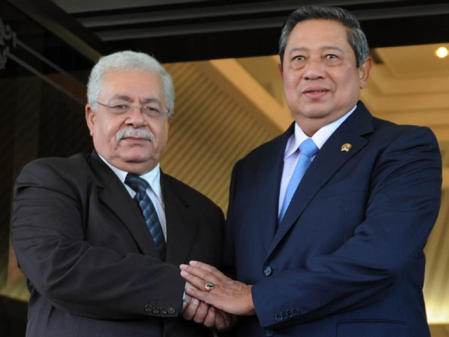 Sebelum bertolak ke Beijing, Presiden SBY menerima Dubes Palestina untuk Indonesia Fariz Mehdawi di Ruang VVIP Bandara Halim Perdanakusuma, Jakarta, Kamis (22/3). Dalam pertemuan tersebut, Presiden menegaskan kembali dukungan Indonesia terhadap kemerdekaan Palestina.