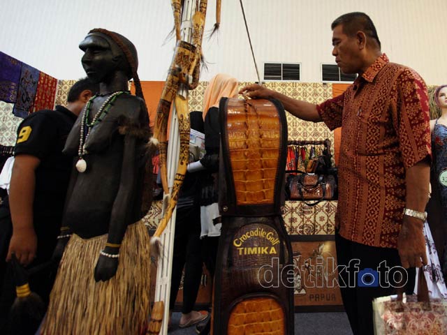 Kerajinan asal Papua Barat mencuri perhatian pengunjung dalam Pameran Kerajinan Nasional Indonesia 2012 di Gedung Smesco, Jakarta, Kamis (22/3). Kain batik, tas pinang, bermacam pernak-pernik, herbal seperti ekstrak buah merah,tanaman kebar serta patung-patung dan pahatan didatangkan langsung dari pengerajin Papua Barat.