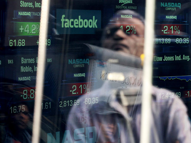 Warga New York melintas diantara papan bursa efek Nasdaq yang menampilkan logo Facebook, sehari sebelum go public, Kamis (17/5/2012) waktu setempat. Facebook akan melepas perlembar saham senilai US$ 38. Nilai ini akan mengukir rekor baru dalam dunia internet, mengalahkan nilai Google pada 2004 yang mencapai US$ 23 miliar. Berniat memborong? (Foto-foto: Justin Sullivan/Getty Images)