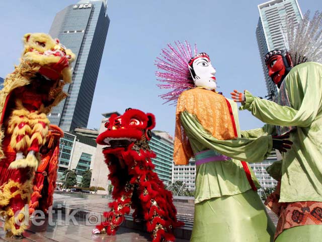Warga Tionghoa yang tergabung dalam Komunitas Tionghoa Anti Korupsi (Komtak) melakukan kampanye anti korupsi dengan membawa barongsai dan ondel-ondel di Bundaran HI, Jakarta, Jumat (18/5/2012). Mereka juga mendesak pembacok jaksa Sistoyo di Pengadilan Tipikor Bandung, Dedie Sugarda dibebaskan.