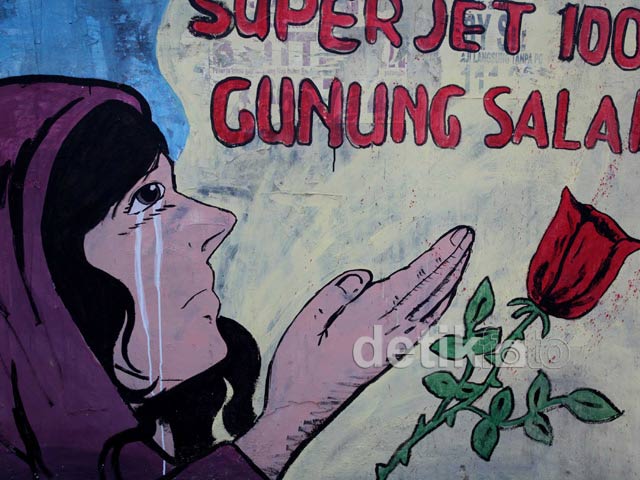 Sebuah lukisan tembok kota (mural) menceritakan tragedi Sukhoi SuperJet 100 terlihat di kawasan Gandaria, Jakarta Selatan, Selasa (22/5/2012). Seorang perempuan digambarkan menangis, pesawat Sukhoi yang menabrak gunung dan 3 tengkorak digambarkan bergentayangan di gunung tersebut.