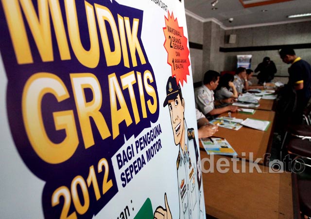 Kementrian Perhubungan (Kemenhub) membuka pendaftaran mudik gratis untuk para pemudik motor di Kemenhub, Jakarta, Senin (6/8/2012). Hanya saja, mudik gratis ini dengan cara motor dinaikan truk, sementara pemudik menggunakan bus.