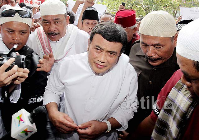 Pedangdut Rhoma Irama diminta klarifikasi soal ceramah bermotif SARA di Panwaslu DKI Jakarta, Senin (6/8/2012). Di luar gedung, puluhan pendukung dan penggemar fanatik Rhoma Irama berdemo dan memberi semangat kepada artis pujaan.