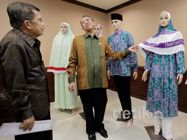 Menteri Agama Suryadharma Ali memamerkan seragam haji Indonesia kepada mantan Wakil Presiden Jusuf Kalla di kantornya, Jl MH Thamrin, Jakarta, Selasa (7/8). Menag Suryadharma menjelaskan, batik masih menjadi motif seragam pria. Sementara perempuan dibuat list merah putih pada jilbab yang dikenakan.