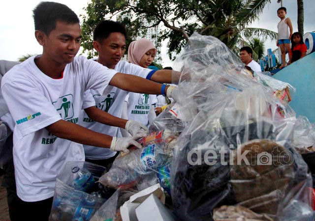 Para pengunjung membersihkan sampah yang berserakan di Pantai Ancol, Jakarta Utara, Selasa (1/1/2013). Kegiatan bersih-bersih dengan dipelepori oleh manajemen PT Pembangunan Jaya Ancol itu dilakukan dalam rangka meminimalisir sampah yang kemungkinan membludak akibat padatnya pengunjung.