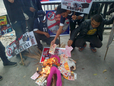 Sembilan orang berdemo dengan membakar boneka dan foto Andi Mallarangeng dan Angelina Sondakh, di Medan, Sumatera Utara (Sumut). Pembakaran itu dilakukan dengan ritual adat Cina.
