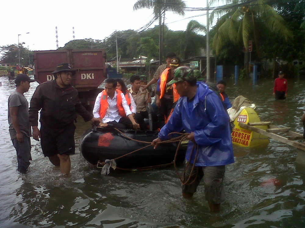Gubernur DKI Jakarta Joko Widodo atau Jokowi mendatangi lokasi banjir di Pluit, Jakarta Utara. Jokowi dengan menaiki perahu karet berkeliling. Jokowi pun sempat menyapa para korban banjir.