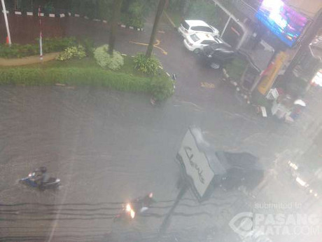 Hujan deras yang mengguyur Jakarta Selatan membuat genangan air di kawasan Kemang, Jakarta Selatan. Genangan air ini membuat lalu lintas di kawasan ini tersendat.