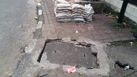 Got ini adalah tempat Dadan menyelam. Aksi pasukan oranye ini kemudian menjadi viral di media sosial. Di sampingnya ada tumpukan karung berisi lumpur got.