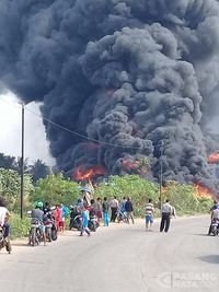 Asap hitam membumbung tinggi dari api yang membakar ribuan tumpukan ban bekas.