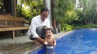 Jan Ethes tampak kegirangan saat dimandikan Jokowi dan sesekali berteriak serta tertawa bersama sang kakek.