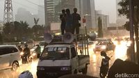 Walau diguyur hujan, mereka tetap menjalankan aksinya. Mereka mengenakan pakaian seragam berwarna biru yang robek (compang-camping).