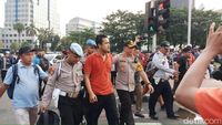 Seorang pria berbaju merah diamankan polisi di sekitar Patung Kuda yang jadi tempat aksi massa kawal sidang MK.